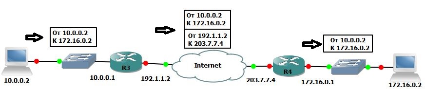 Решим первую проблему, общение хостов с серыми адресами. В чем собственно сама проблема? Хост с таким адресом может легко обратиться к хосту с реальным IP, при этом NAT роутер заменит серый адрес на свой публичный и создаст запись о таком преобразовании. Реальный хост в интернете ответит на публичный адрес NAT роутера, а тот в свою очередь передаст пакет узлу с серым адресом в соответствии с созданной ранее записью. Если же записи нет, то невозможно обратиться к хосту с серым адресом по публичному адресу роутера. А обратьться напрямую на серый адрес невозможно в принципе, ибо такие адреса не маршрутизируются в интернете. Как вариант нужен некий узел посредник в сети интернет с адресом известным обоим сторонам. Через этот узел мы и будем пробивать “дырки” в NAT роутерах. И таких вариантов великое множество, начиная от служб коротких сообщений и заканчивая системами видеонаблюдения. Кстати с развитием облаков, такая опция становится очень популярной. Ресурсов от такого прокси много не требуется, разворачивается решение очень быстро. Но удобно это для единичных сервисов, а не для организации составной сети предприятия. Остается вариант с туннелированием. Подход так же довольно распространенный. Если, что-то в данной среде невозможно или запрещено, то это, что-то можно упаковать в то, что разрешено и законно передать. Гусеничный трактор может ездить по полям, но ему запрещено ездить по асфальту. А если с одного поля на другое есть только шоссе, то трактор можно поставить на трейлер и перевезти. Вот такое туннелирование. Анология очевидна. Серые адреса запрещены в интернете, поэтому пакет от одного серого IP к другому упаковать в пакет от реального IP одного роутера к реальному IP другого. На рисунке ниже, у роутера R3 должна быть директива “пакеты в сеть 172.16.0.0/24 упаковывать в IP пакет от 192.1.1.2 к 203.7.7.4. А получившийся в результате этого пакет маршрутизировать, как обычно по своей таблице маршрутизации. Заметьте, что это еще не решение проблемы прохода через NAT. Как раз наоборот. Мы пытаемся обойти NAT и использовать обычную маршрутизацию законных пакетов, в которых будут находиться “не совсем законные”. Напомню, если NAT работает в режиме PAT, то он привязывается еще и к портам, которых у IP просто нет. Поэтому NAT мы обходим. Натирование в интернет будет работать. А пакеты в удаленную сеть предприятия мы отправляем через туннельный интерфейс, который в NAT конфигурации не участвует. Мы привыкли, что маршрут в таблице явно указывает на интерфейс, через который отправлять пакет, а тут указан пакет в который упаковать исходный.